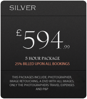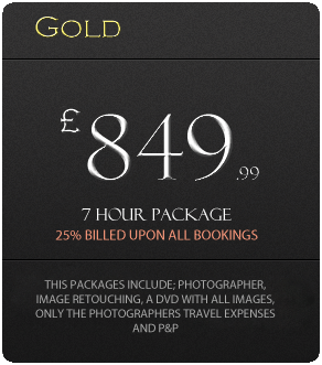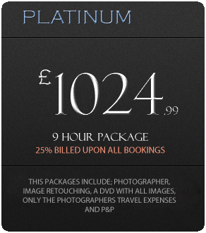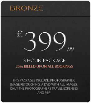 All packages listed above including the Bronze package, Silver Package, Gold package and Platinum package includes a professional photographer, image retouch and editorial for a specified time, please review details under relevant sections for specified time frames. All packages do not include hair and makeup artists, a second shooter or extra photographer. All packages also include travel costs and postage and packaging of your DVD or memory stick to a specified address of your choice. Please click here or the enquiry button to proceed your booking.